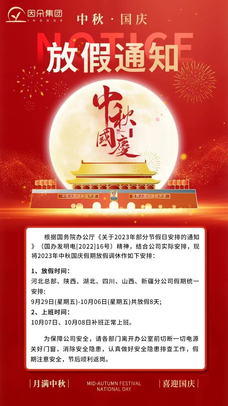 根据国务院办公厅《关于2023年部分节假日安排的通知(国办发明电[2022116号) 精神,结合公司实际安排,现将2023年中秋国庆假期放假调休作如下安排: