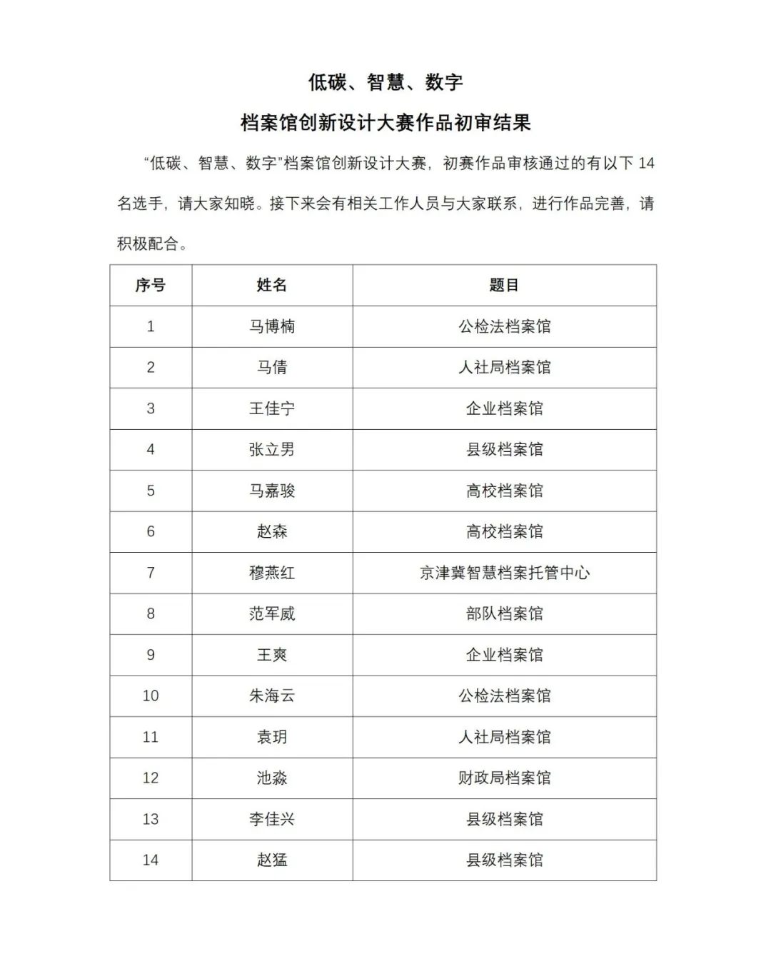 由固安档案馆主办、河北因朵科技有限公司承办的“低碳智慧数字”档案馆创新设计大赛于2023年5月19日进行初审,通过设计图初稿、评委讨论等环节审核,最终有14名选手成功进入决赛。