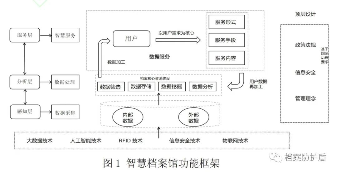 在分析归纳智慧档案馆功能的基础上,本文提出以物联网、区块链、信息安全等高新技术为基础,数据采集、处理、服务、交互为核心,国家顶层设计、政策法规、隐私保护、管理理念为保障,构建一体化的智慧档案馆功能框架。
